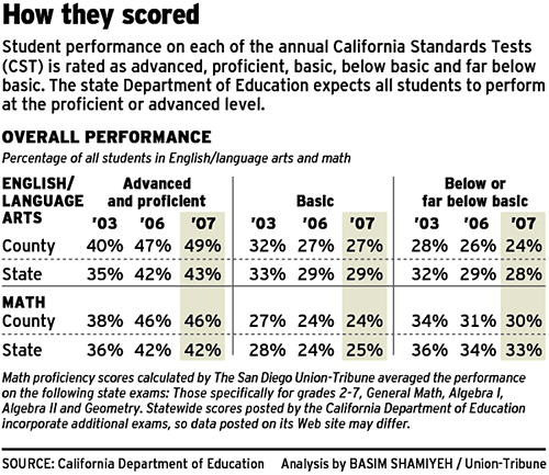 State analyzes scoresThe annual test scores reported yesterday were calculated from a battery of academic tests taken in the spring. The main exams, the California Standards Tests, cover English/language arts, math, science and history/social science.The tests are key measures of academic performance for about 4.8 million students, including more than 370,000 in San Diego County. Scores on the exams are used by the California Department of Education to analyze whether schools are meeting state targets for growth in academic achievement. The scores are used separately by the federal government to determine whether public schools are meeting specific academic benchmarks. Both analyses are scheduled for release at the end of the month. In the latest round of state exams, students in grades two through seven took grade-level math tests. In grades eight through 11, students took math tests that included General Math, Algebra I, Algebra II, Geometry and Summative Math. Summative Math is generally for students who are taking higher-level math courses, such as calculus, or for those who have completed all college-preparatory math classes. Individual student scores, on a scale between 150 and 600, are grouped into five levels of performance: advanced, proficient, basic, below basic and far below basic. The state target for all students is to score proficient or advanced on all of the California Standards Tests. The minimum score required to achieve proficiency on any exam is 350.